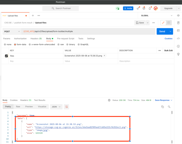 Domain Example: `https://api.qc.cxgenie.ai/` Method: POST Endpoint: `/api/v2/files/upload/form-builder/multiple`
